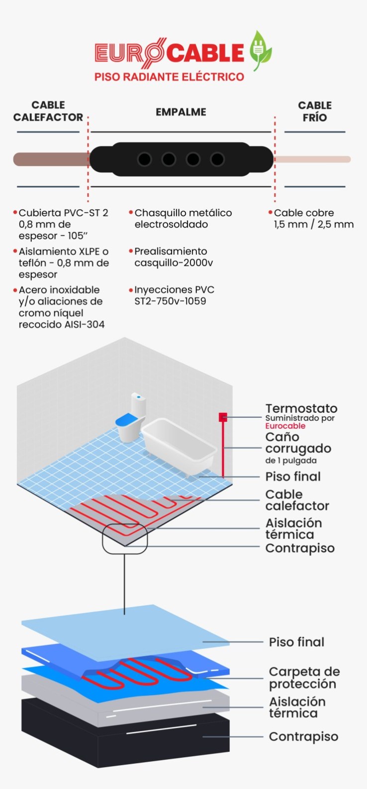 El sistema Eurocable se coloca sobre el contrapiso y no necesita materiales especiales en la carpeta que lo recubre. Como todo piso radiante es esencial contar con un aislamiento térmico por debajo de la instalación con el fin de obtener mayor rendimiento. Solo requiere de un circuito electrónico independiente de las luces y las tomas, con una caja que provee Eurocable en cada ambiente para la colocación de los termostatos.